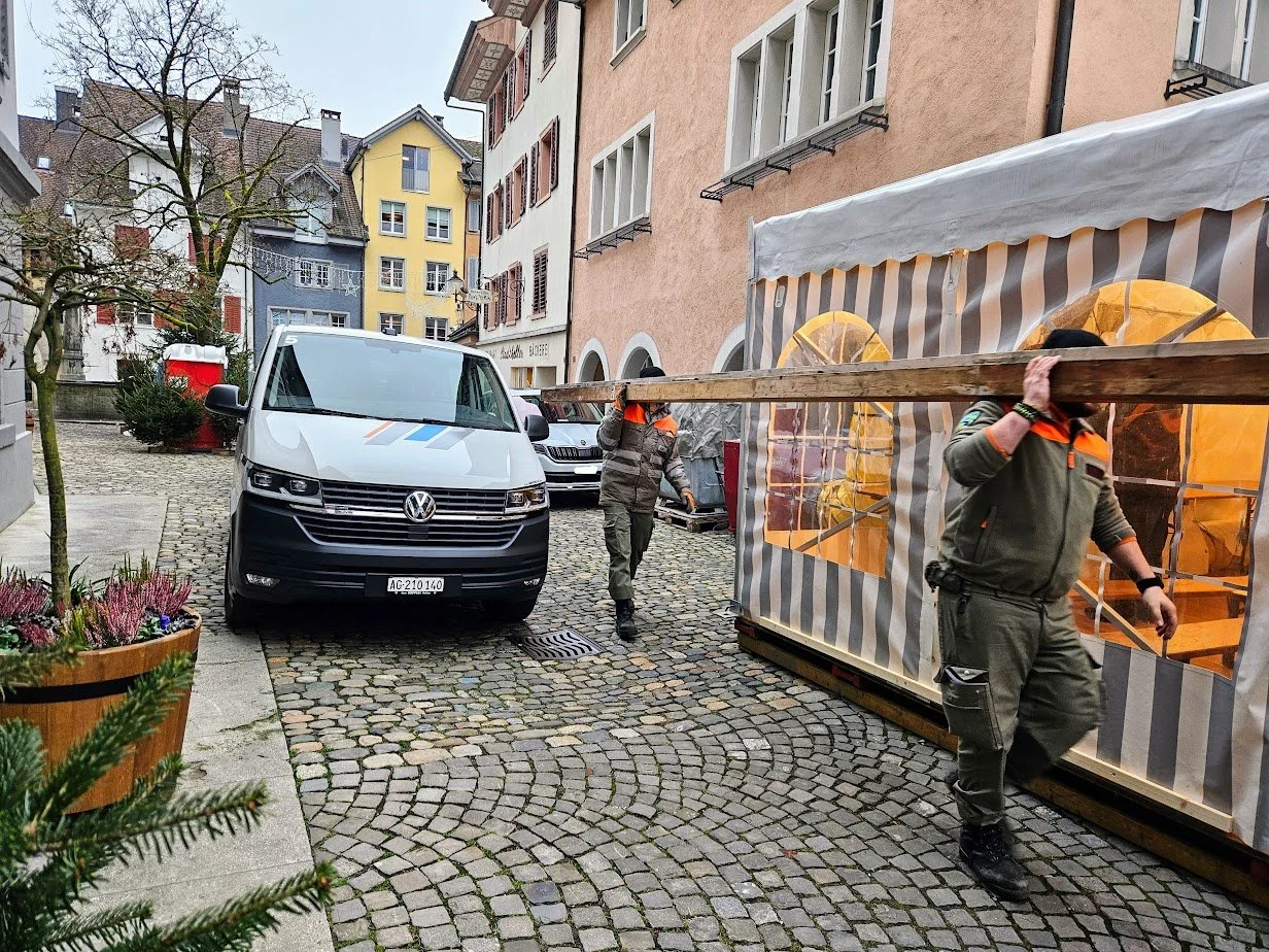 Die Arbeit des Zivilschutzes geht weit über das Offensichtliche hinaus: Sie fällen, transportieren und stellen rund 160 Tannenbäume auf, die das Marktbild prägen, bauen die Glühweinstände auf und übernehmen zahllose logistische Kleinigkeiten - von der präzisen Beschilderung bis zum Auslegen von Holzschnitzeln rund um die Toilettenanlagen. Zudem errichten sie Adventswagen, das Samichlaushüüsli auf dem Postplatz und weitere liebevoll gestaltete Bauten, die den Christchindlimärt zu einem der schönsten seiner Art in der Schweiz machen.